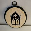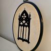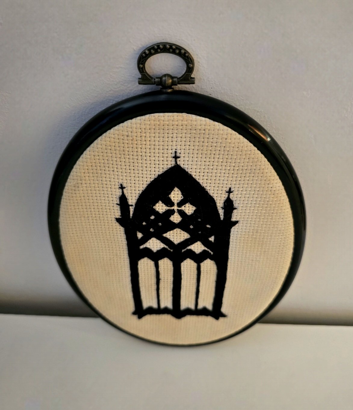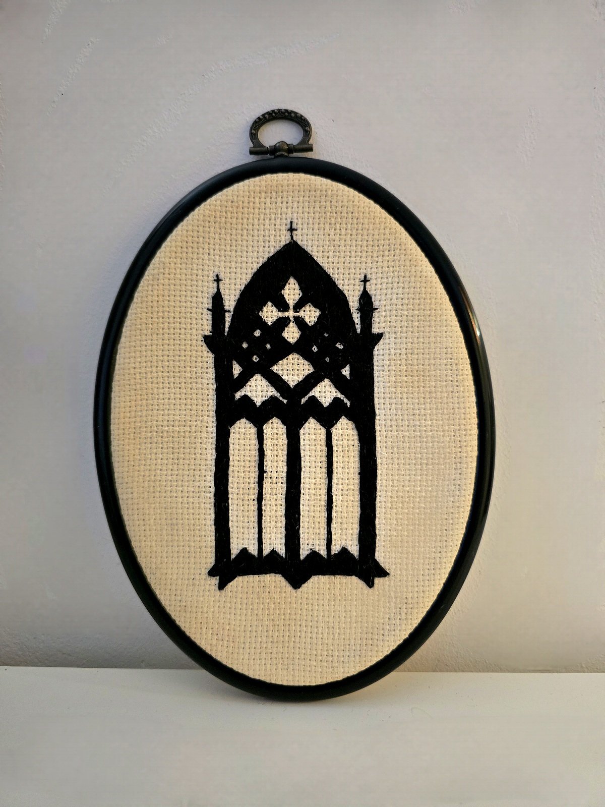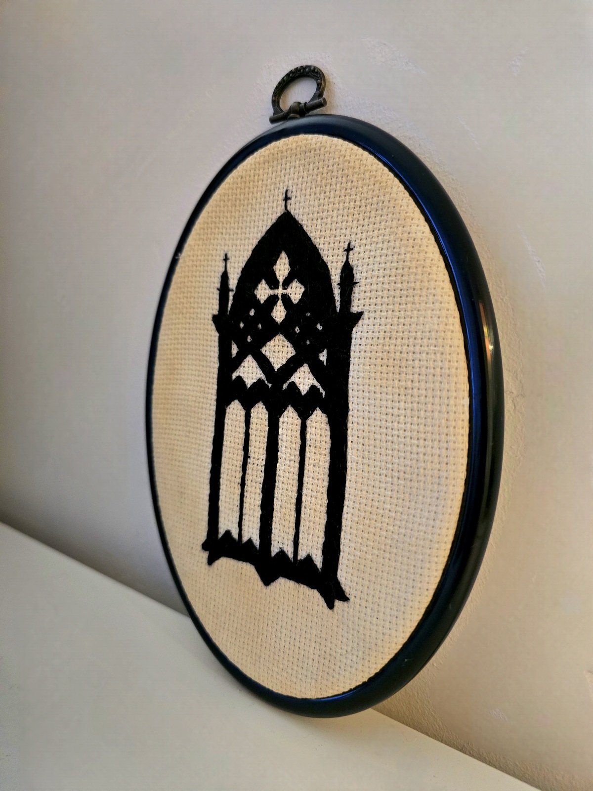 Kirjontatyö – teellä värjätty kangas – korkeus 19,5 cm, leveys 14 cm