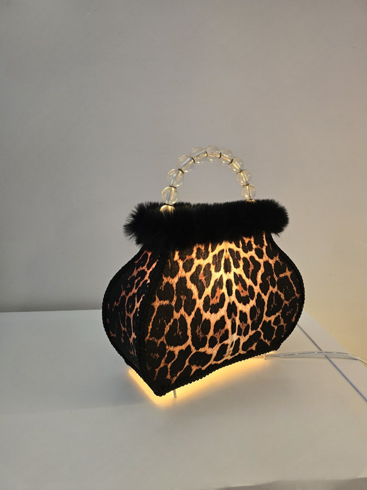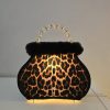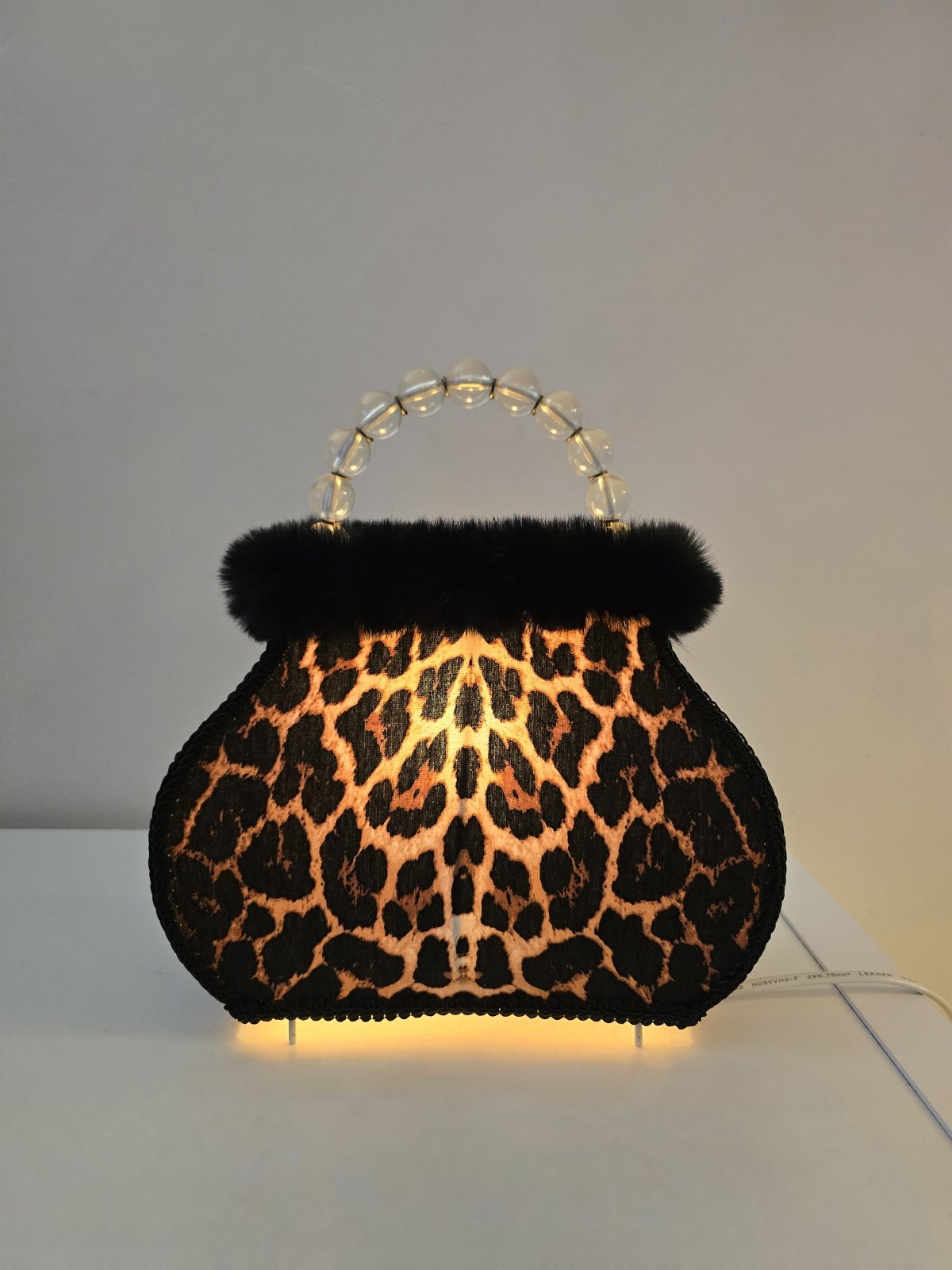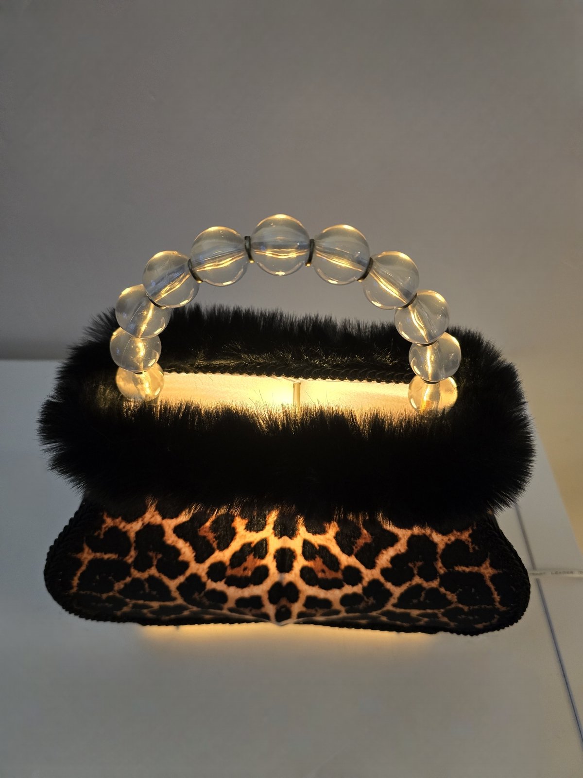 Tunnelmallinen vintage laukkuvalaisin – Verhoiltu leopardikuosilla – Korkeus 28 cm, levein kohta 24,5 cm