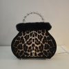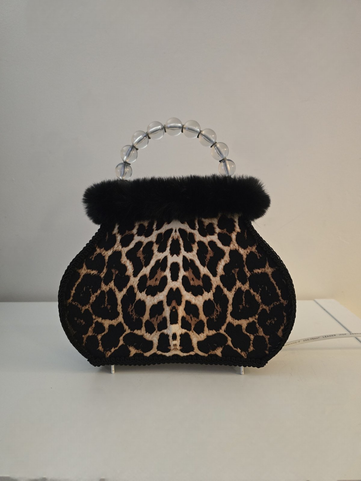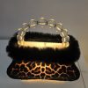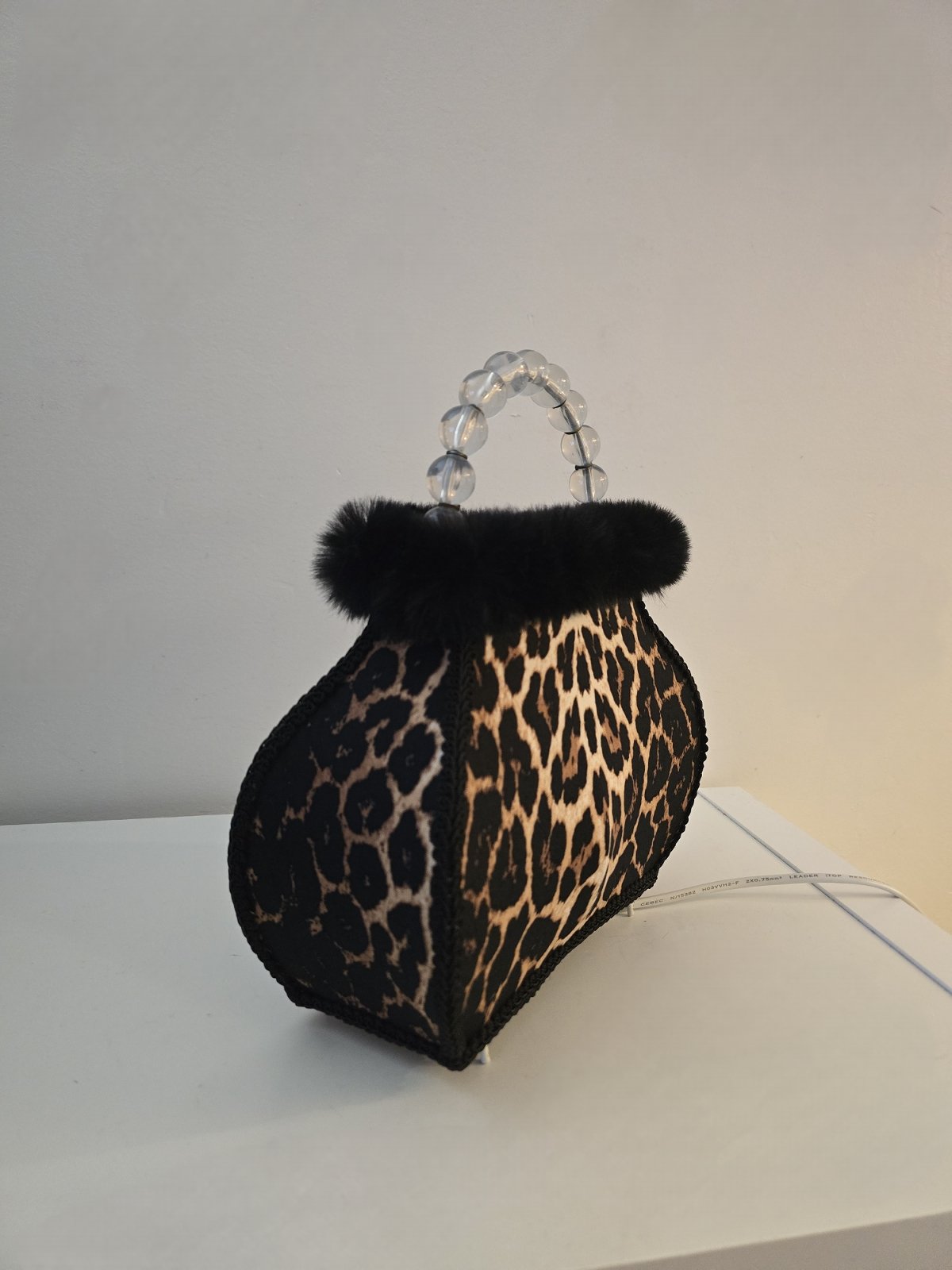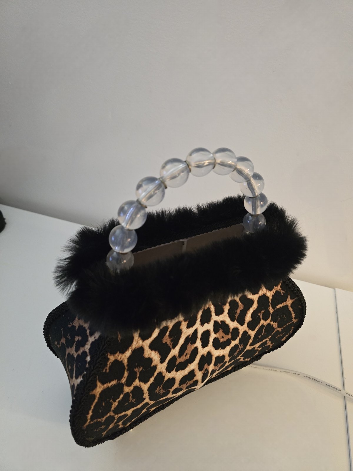 Tunnelmallinen vintage laukkuvalaisin – Verhoiltu leopardikuosilla – Korkeus 28 cm, levein kohta 24,5 cm