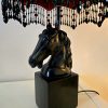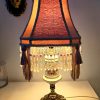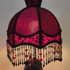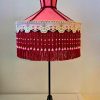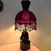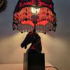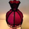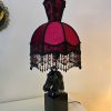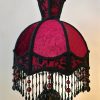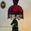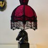 Hevosaiheinen valaisin punamustalla vintage-varjostimella – käsin kootut helmikoristelut – korkeus 58 cm, varjostimen halkaisija 26 cm