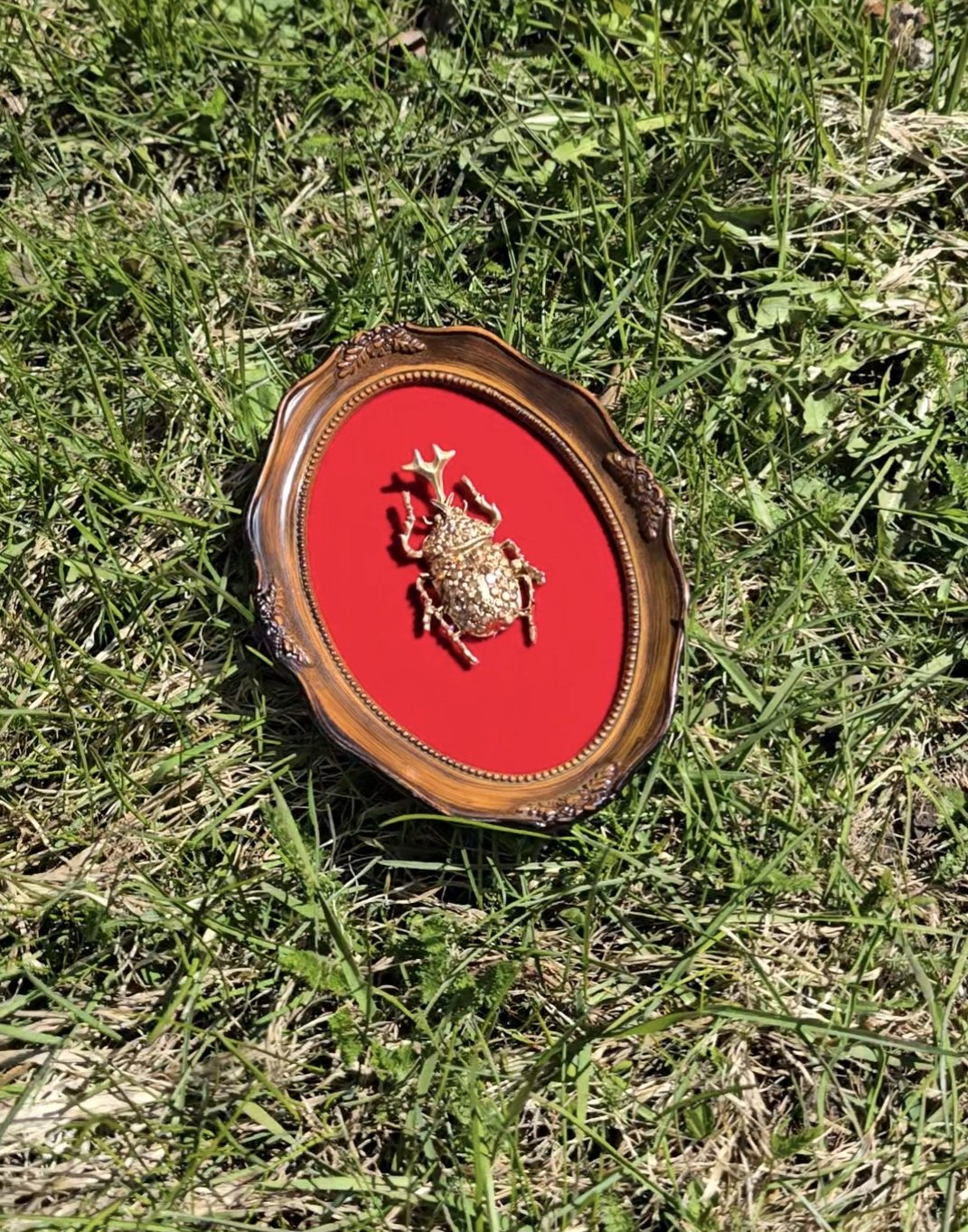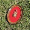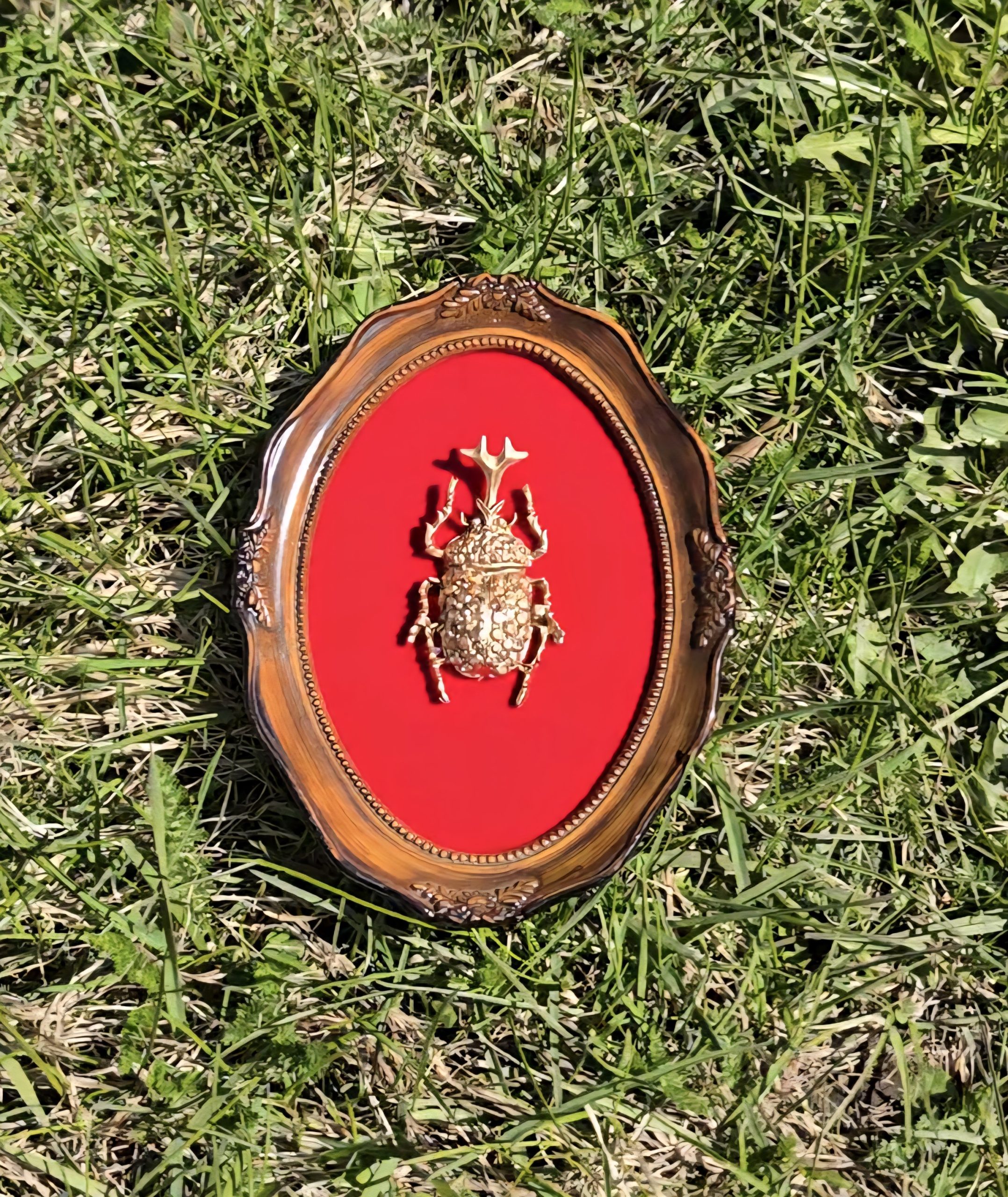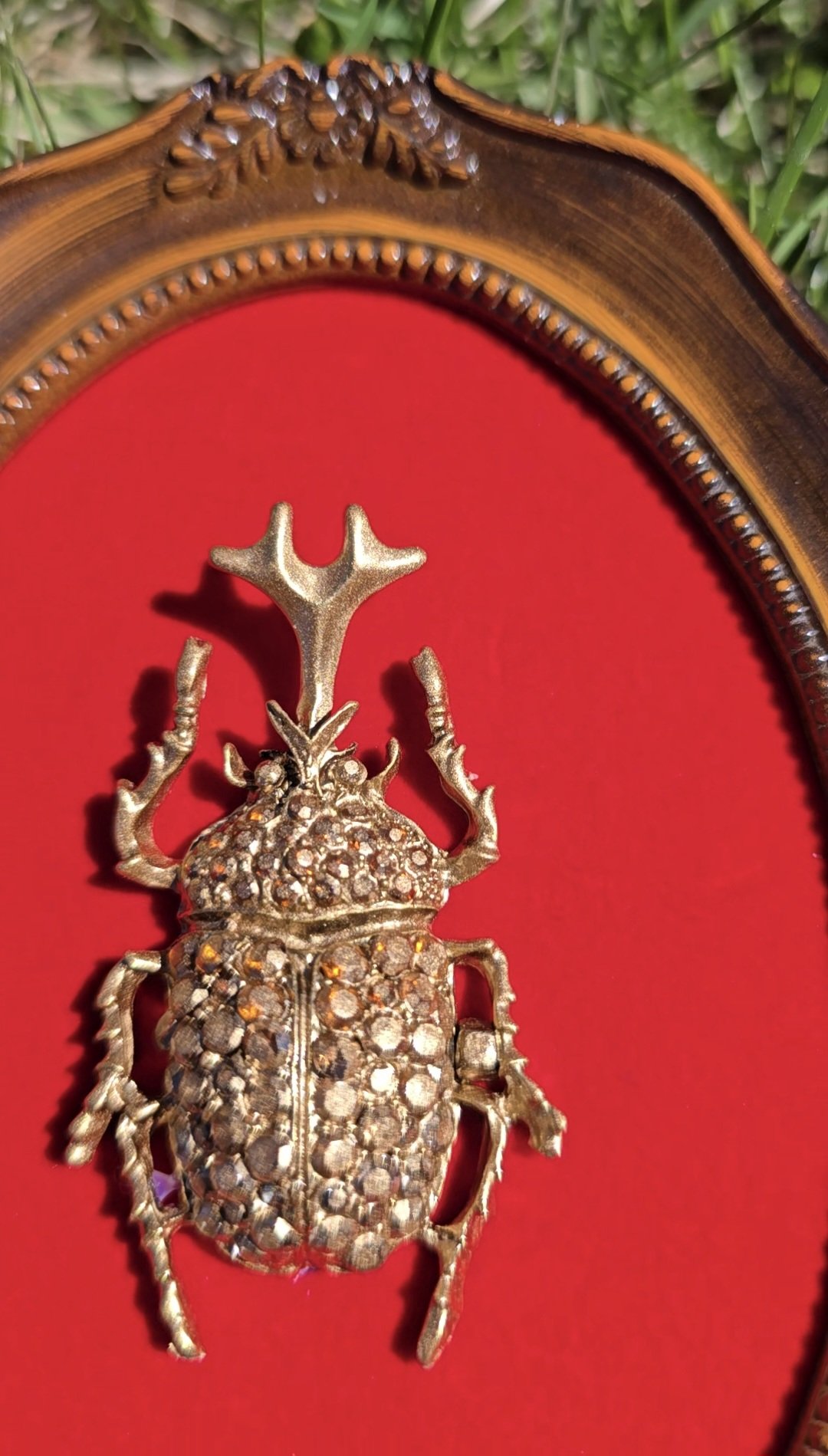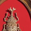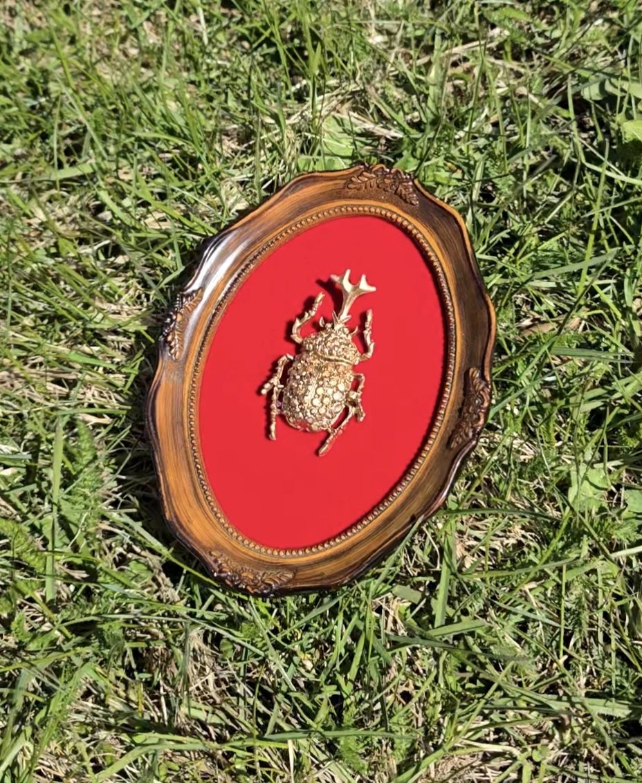 Kultainen kuoriainen kehyksissä, punaisella sametilla. Mitat 12cm x 16cm.