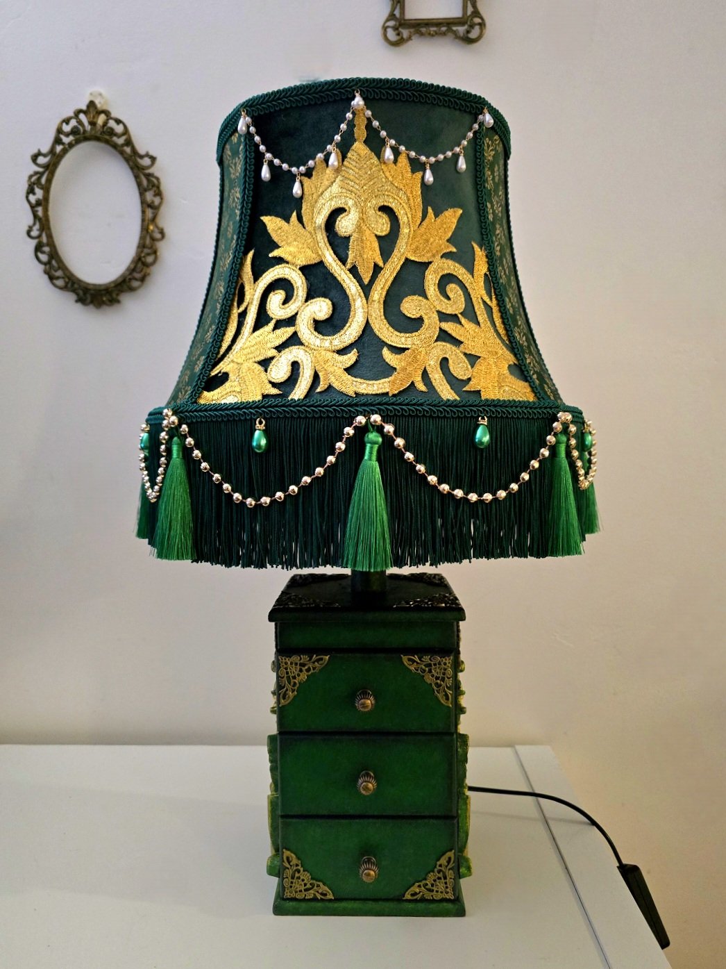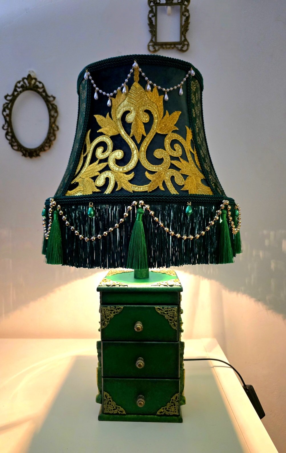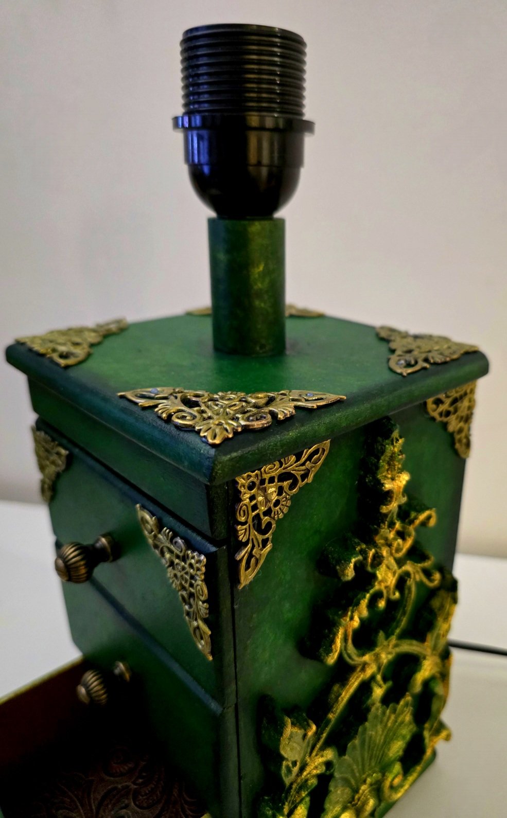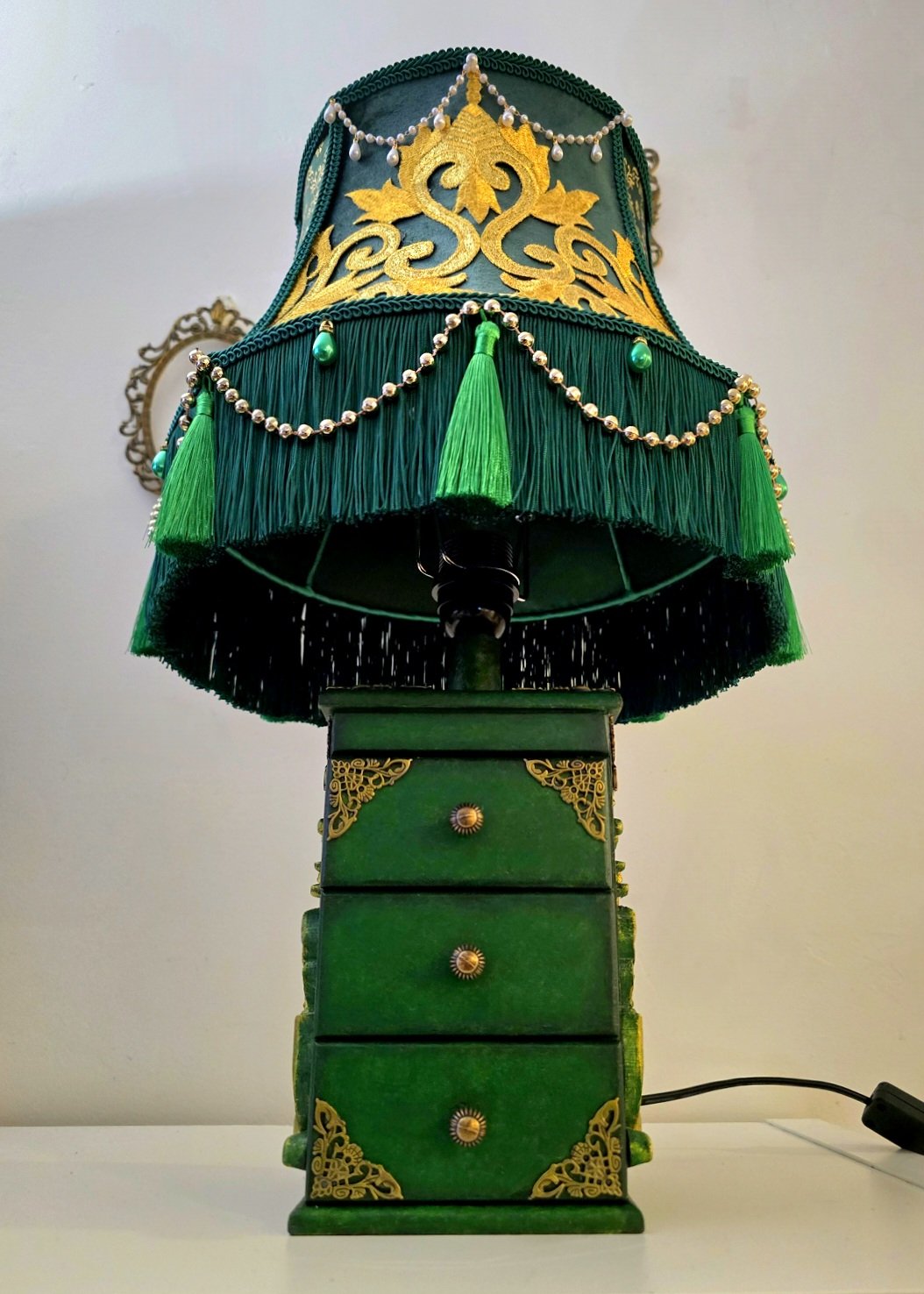 Taianomainen vihreä valaisin! Varjostin on verhoiltu vihreillä kankailla kultaisin yksityiskohdin. Jalkana on ulkokuoreltaan uudistettu pieni lokerikko.