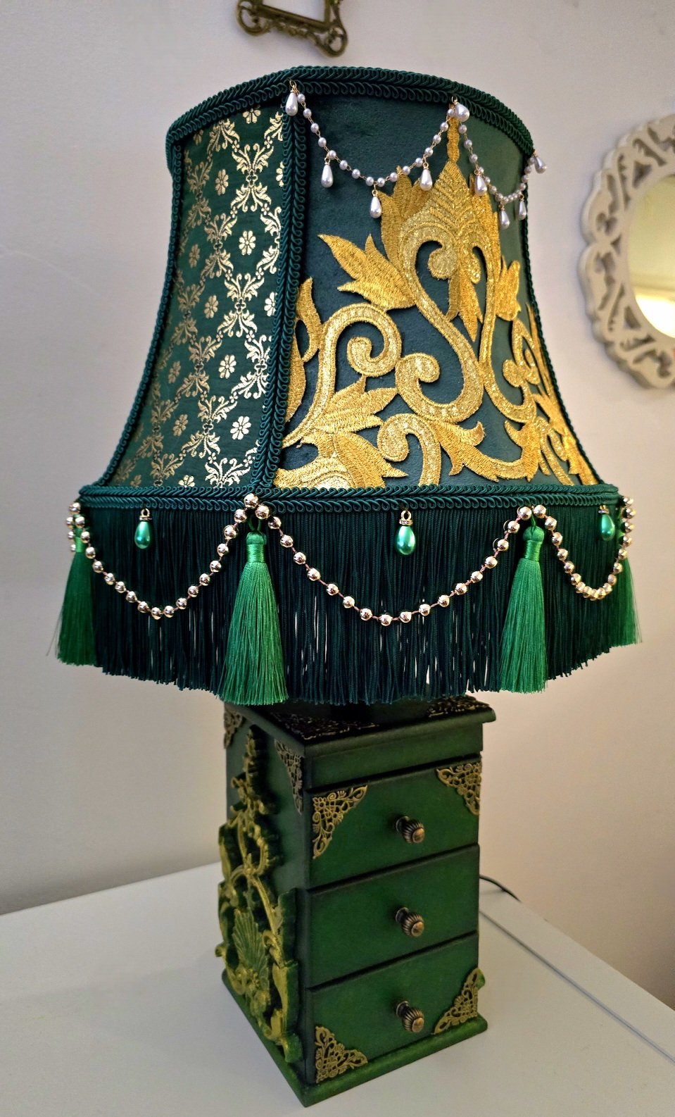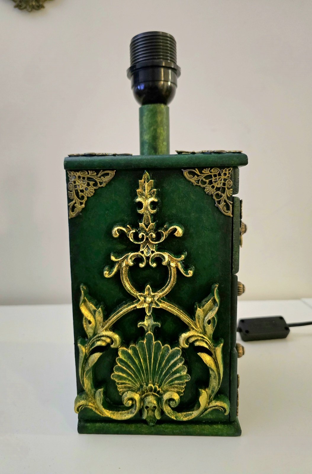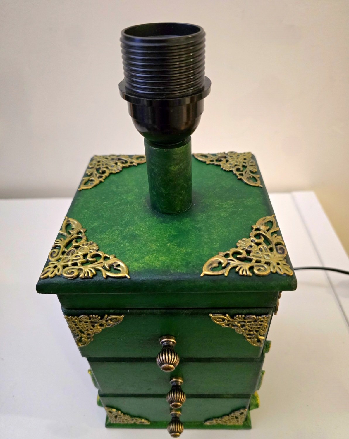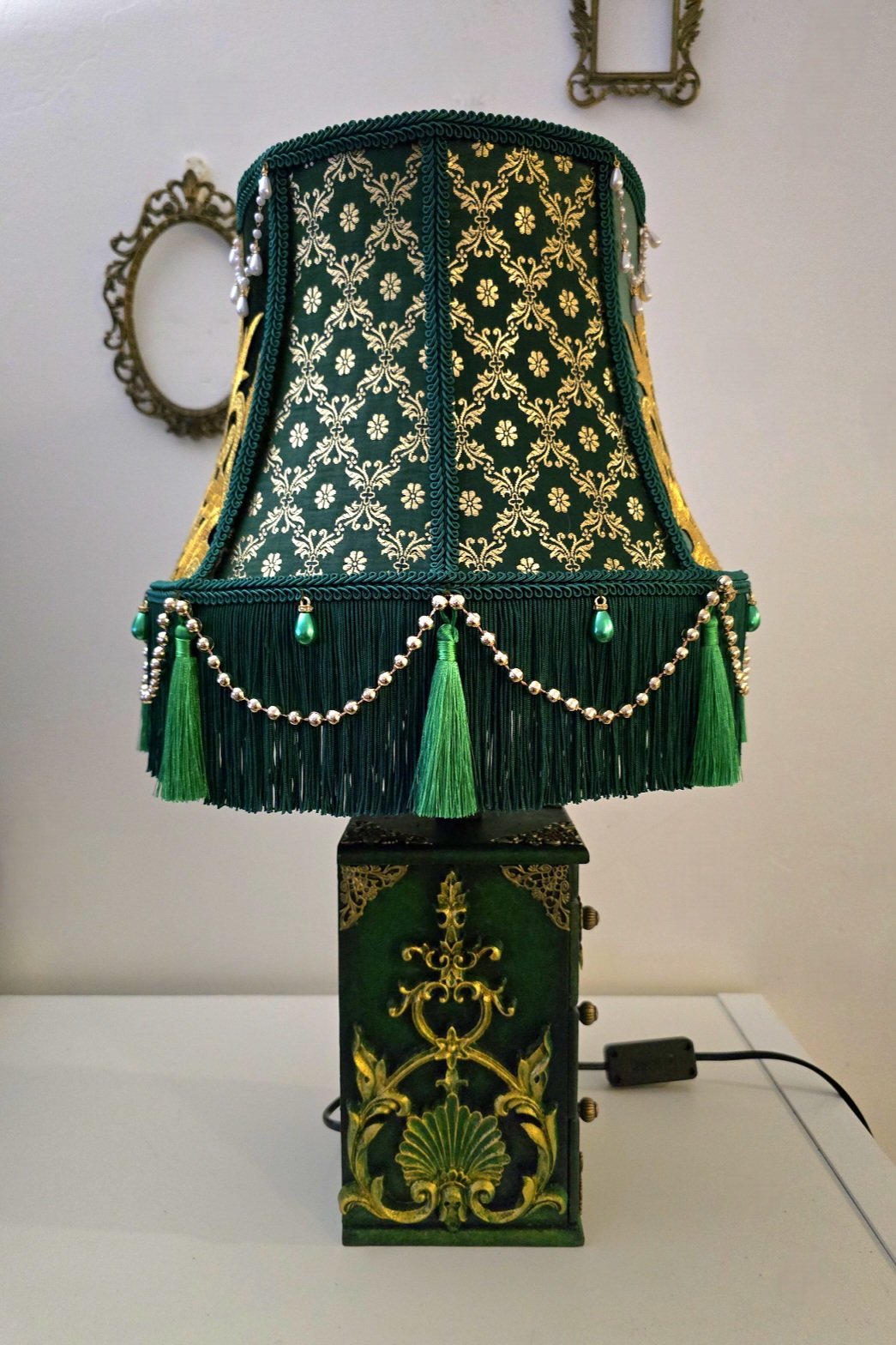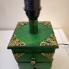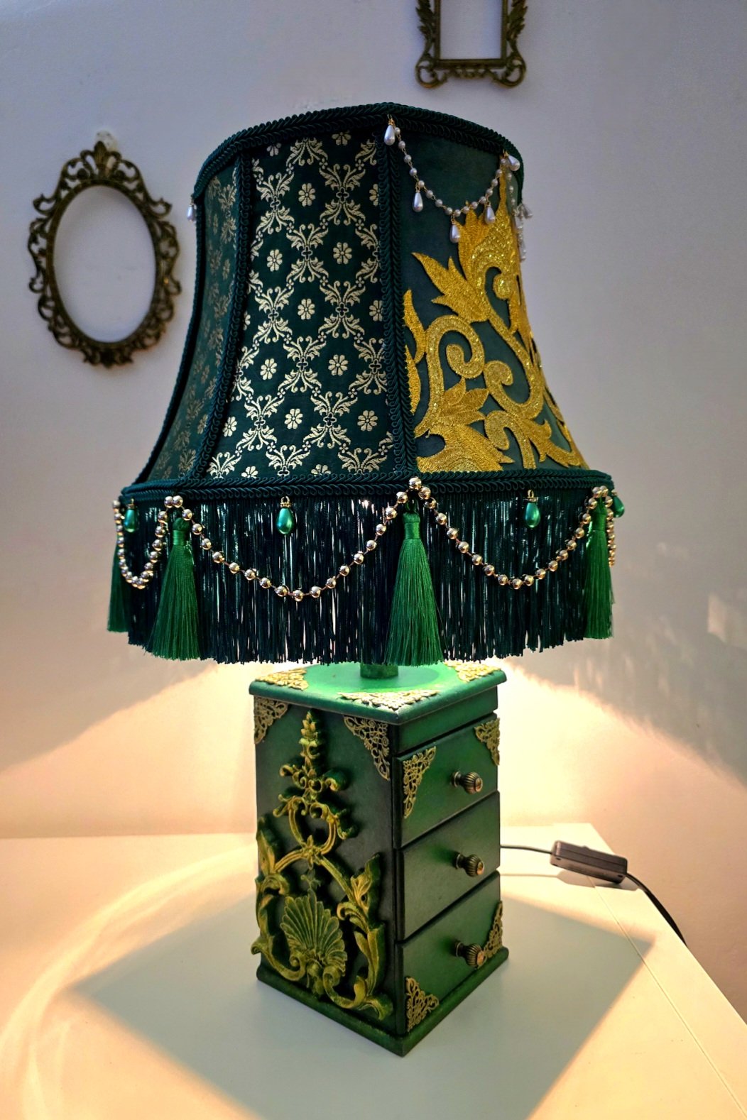Taianomainen vihreä valaisin! Varjostin on verhoiltu vihreillä kankailla kultaisin yksityiskohdin. Jalkana on ulkokuoreltaan uudistettu pieni lokerikko.