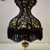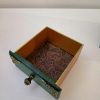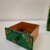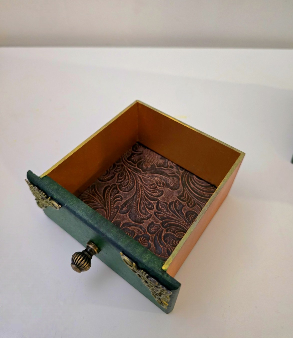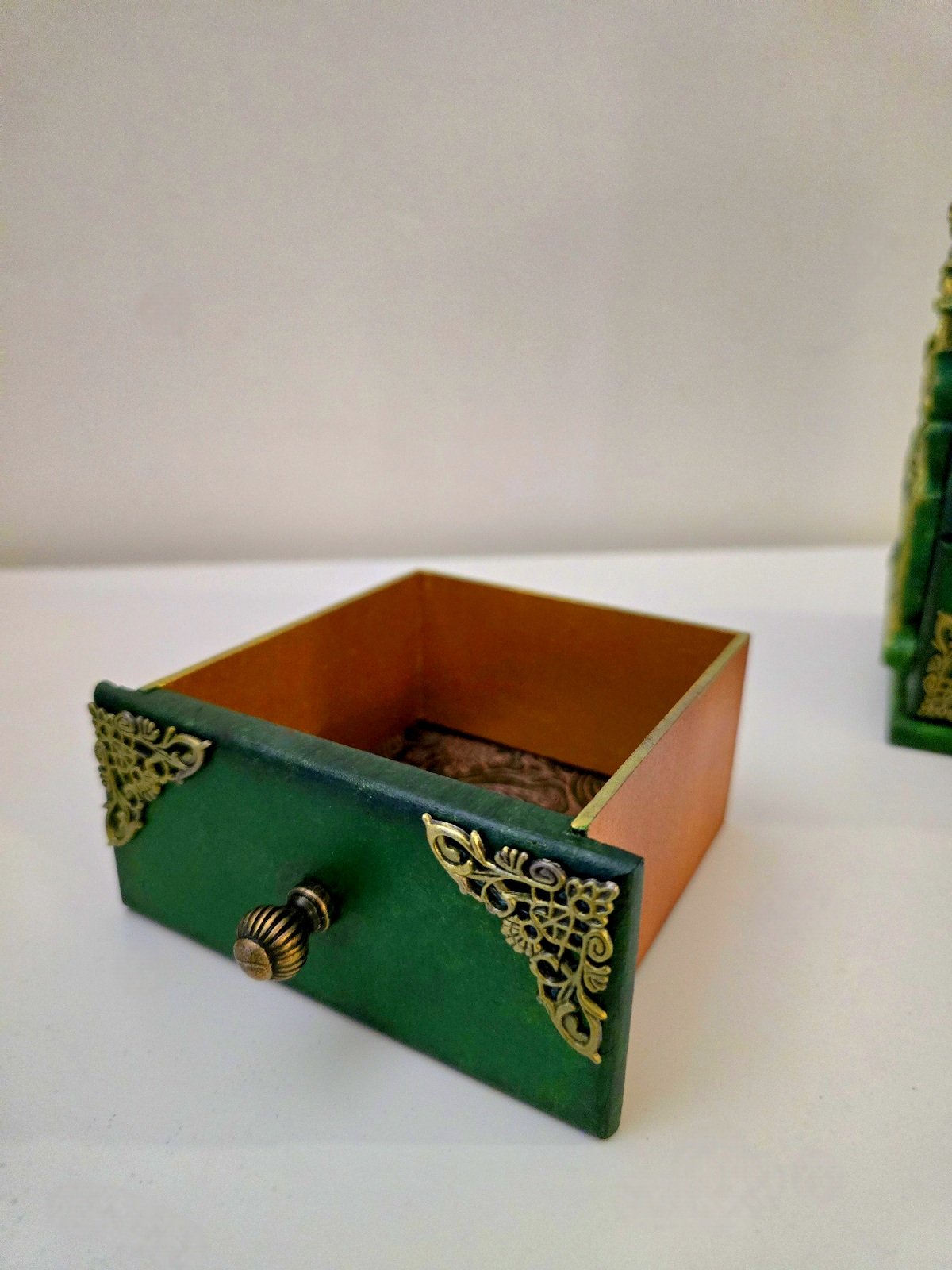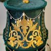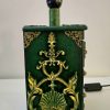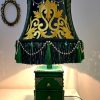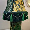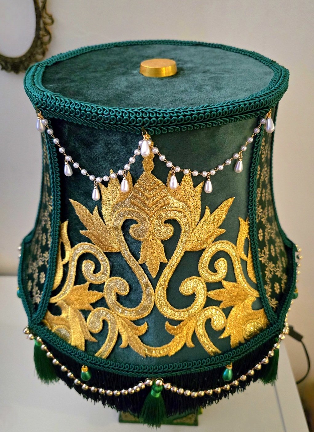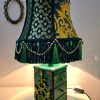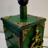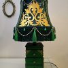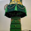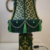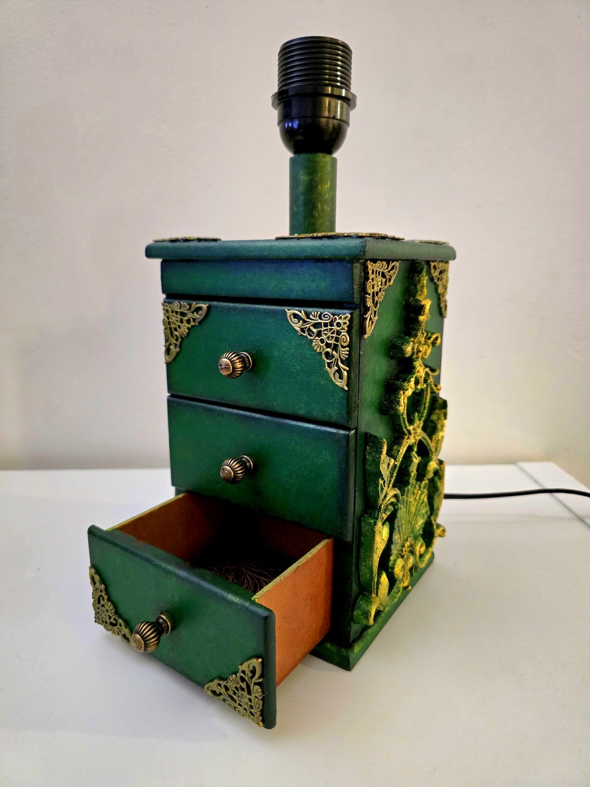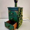 Taianomainen vihreä valaisin! Varjostin on verhoiltu vihreillä kankailla kultaisin yksityiskohdin. Jalkana on ulkokuoreltaan uudistettu pieni lokerikko.