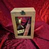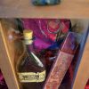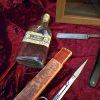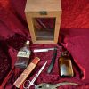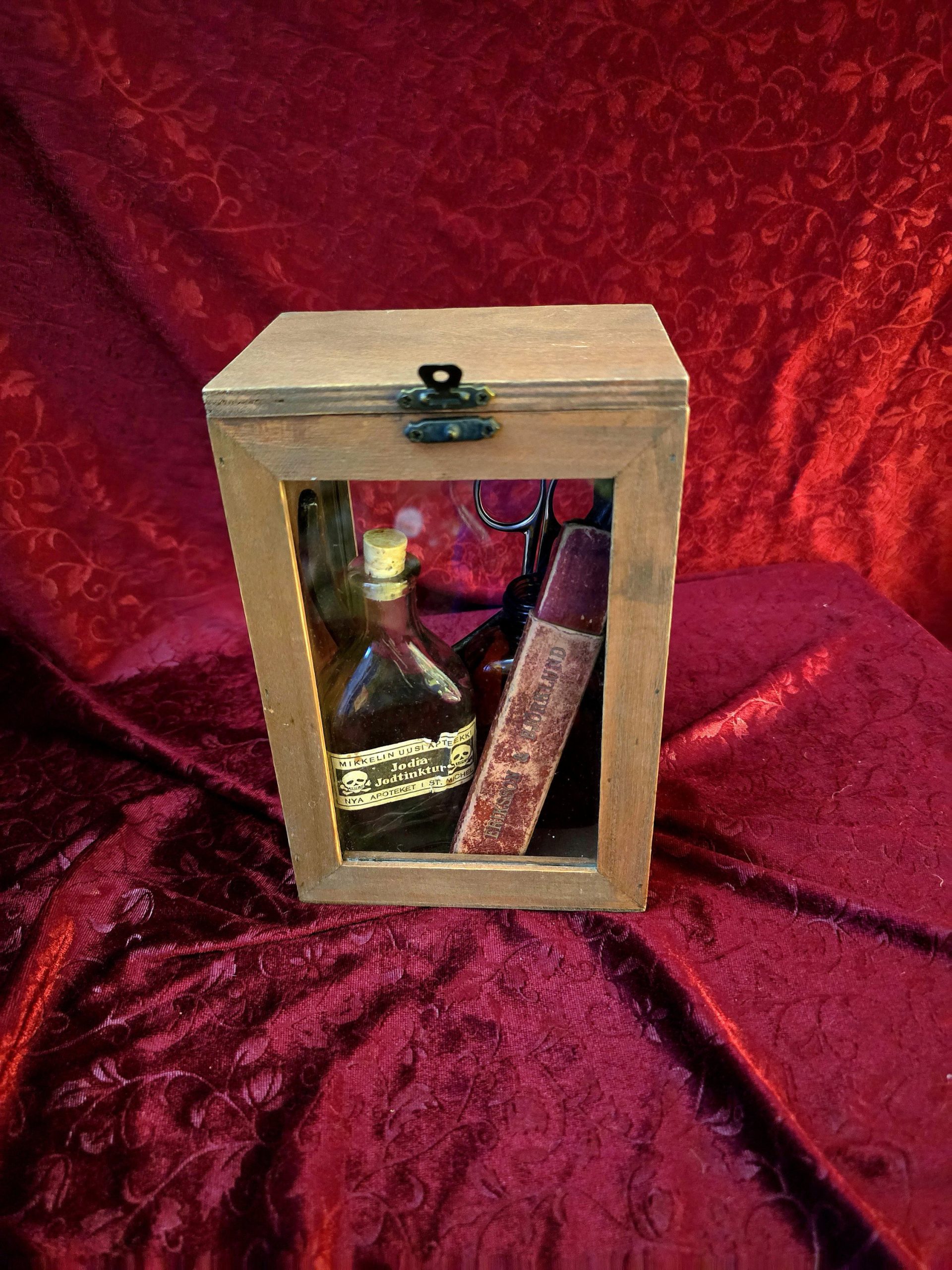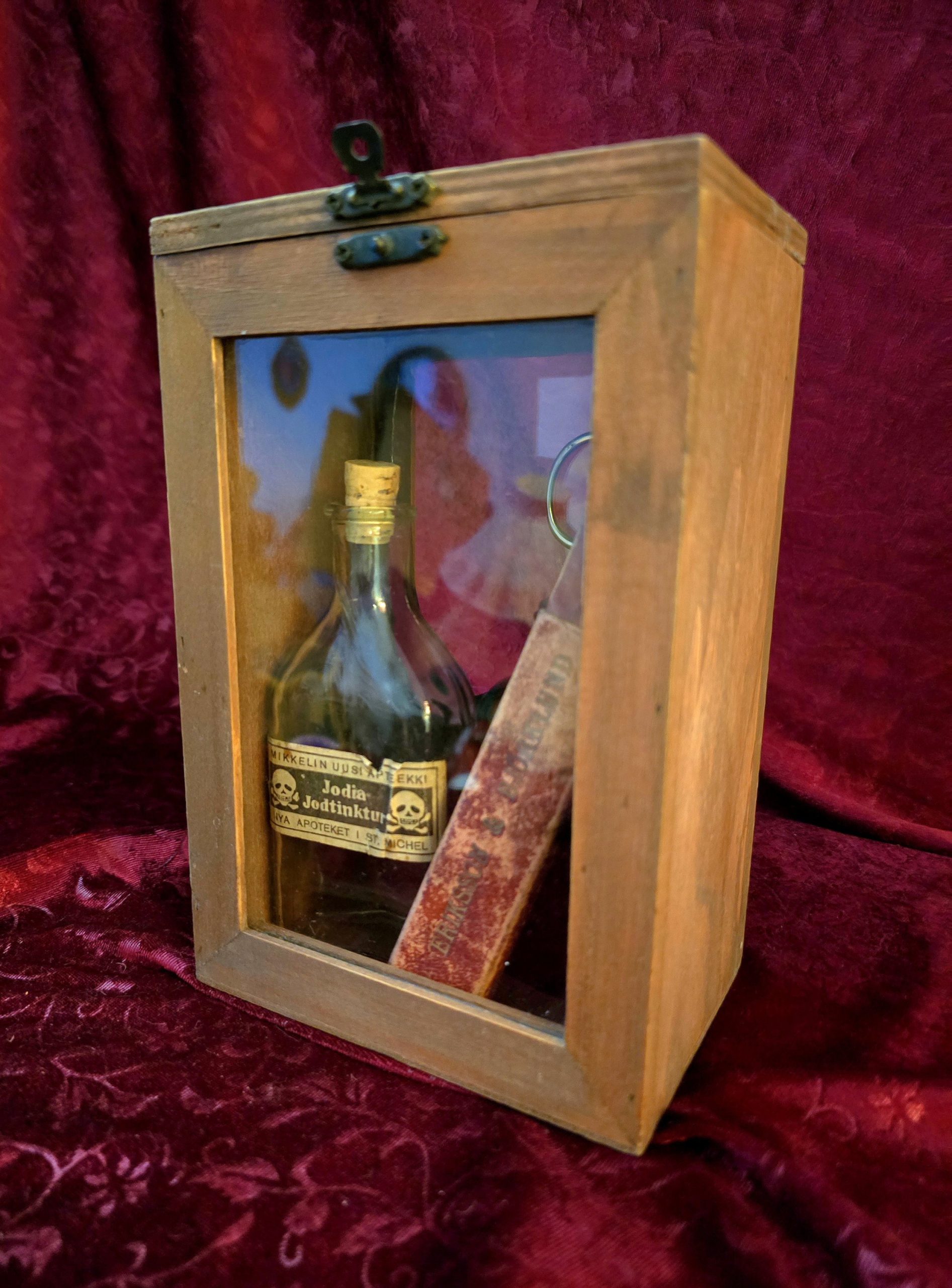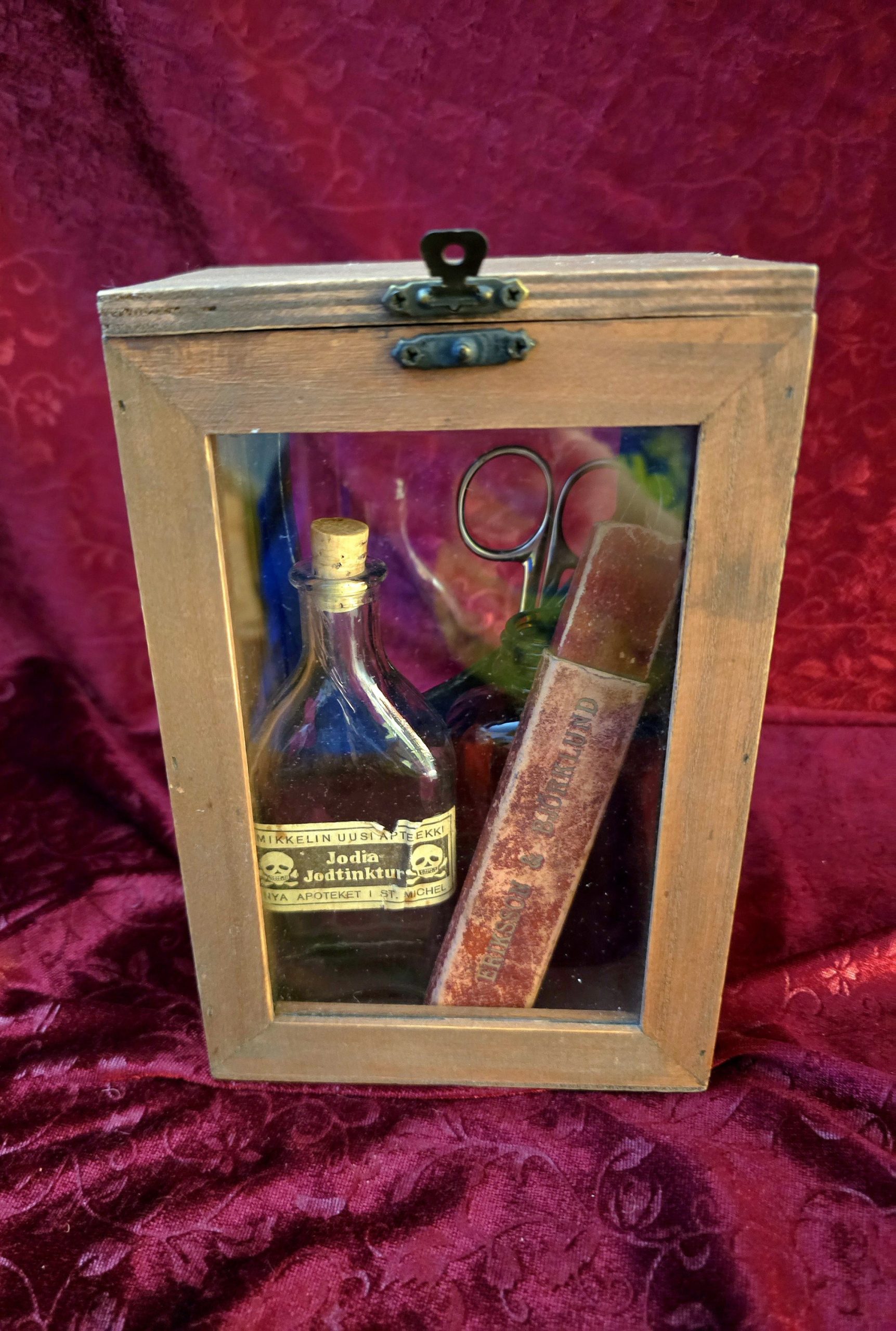 Tool Kit pienessä esittelyvitriinissä. Sisältönä vintage esineitä. Vitriinin korkeus 20 cm, leveys 13 cm.