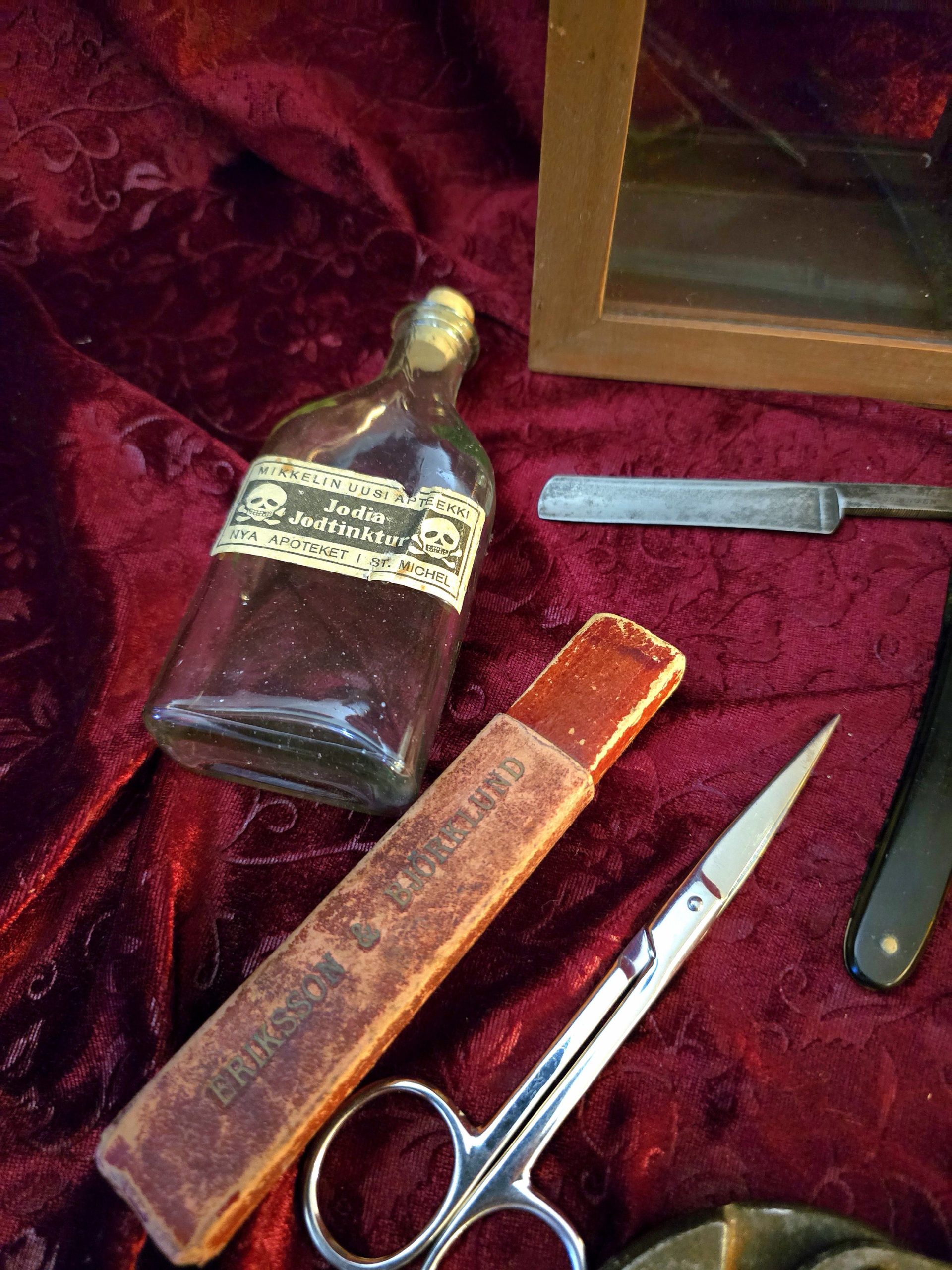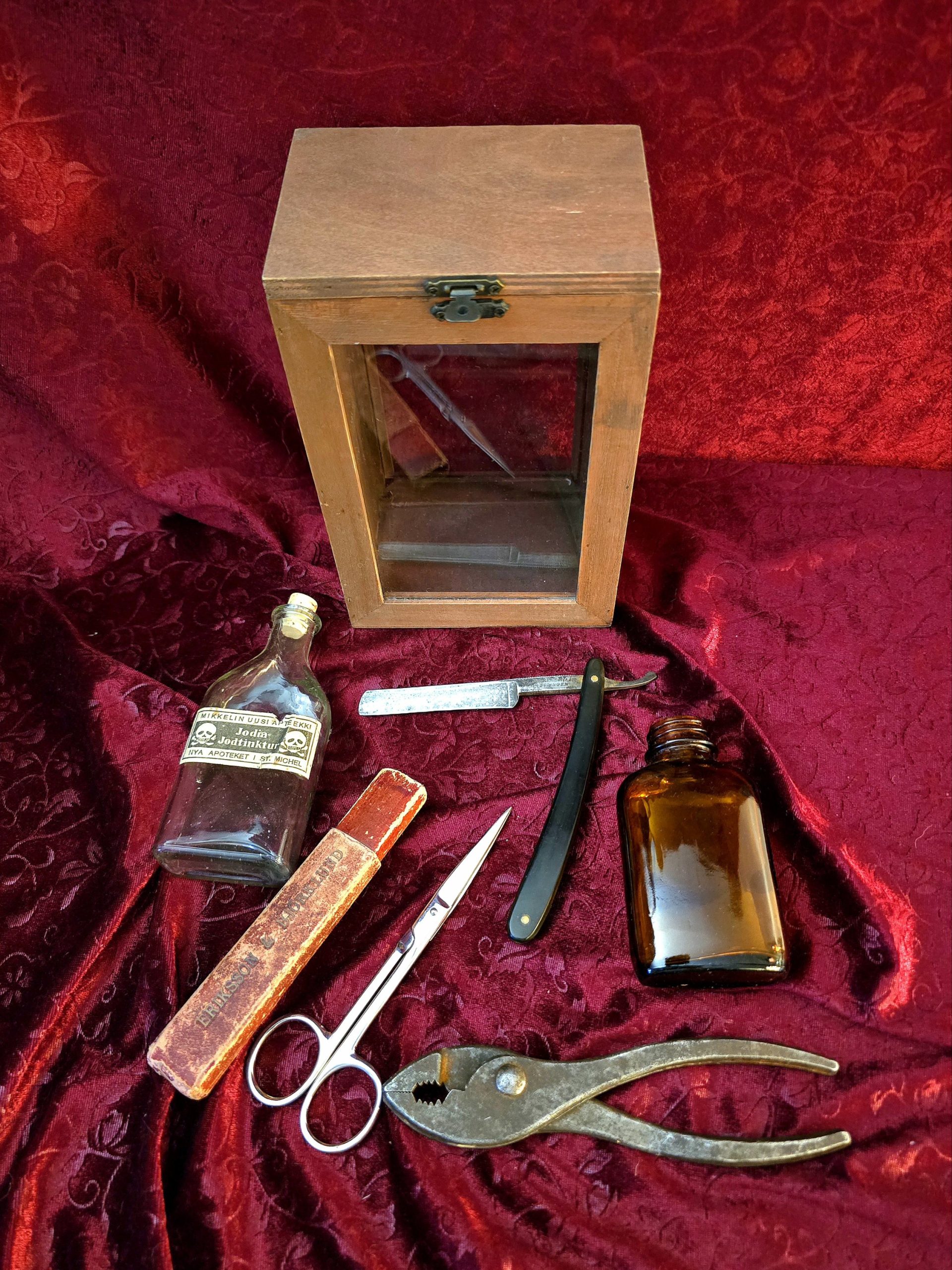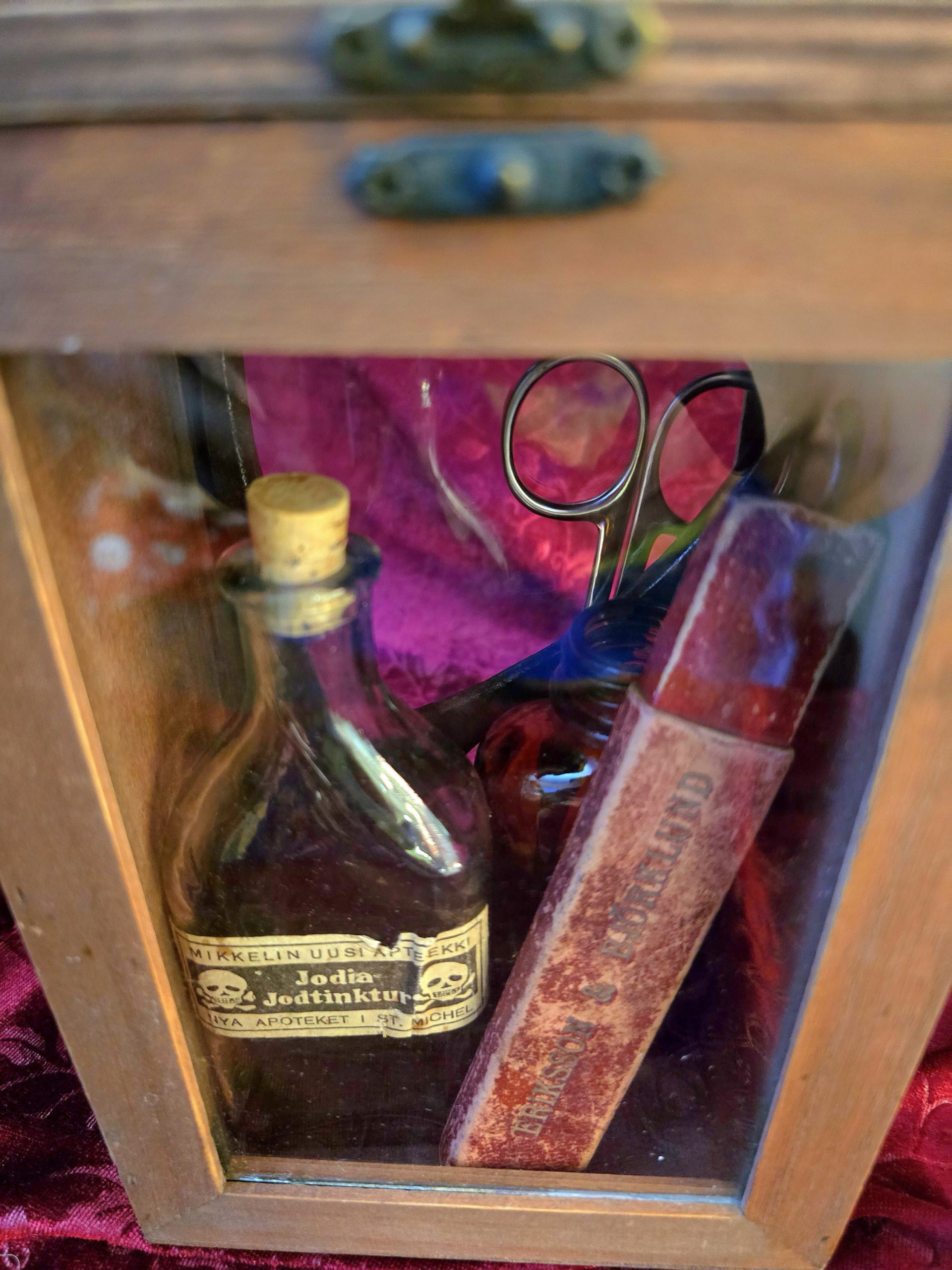Tool Kit pienessä esittelyvitriinissä. Sisältönä vintage-esineitä. Vitriinin korkeus 20 cm, leveys 13 cm.