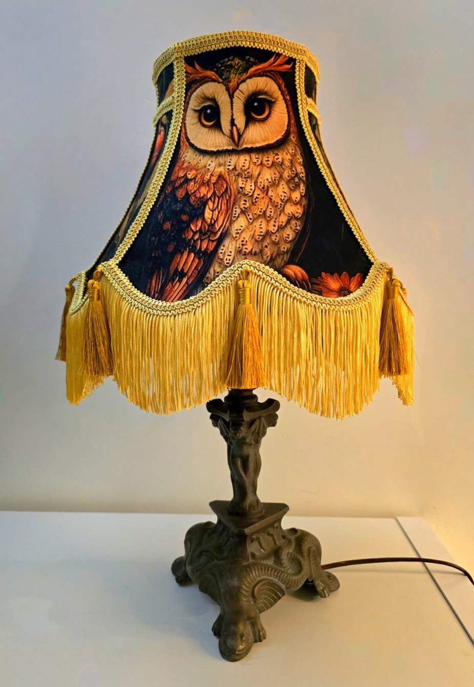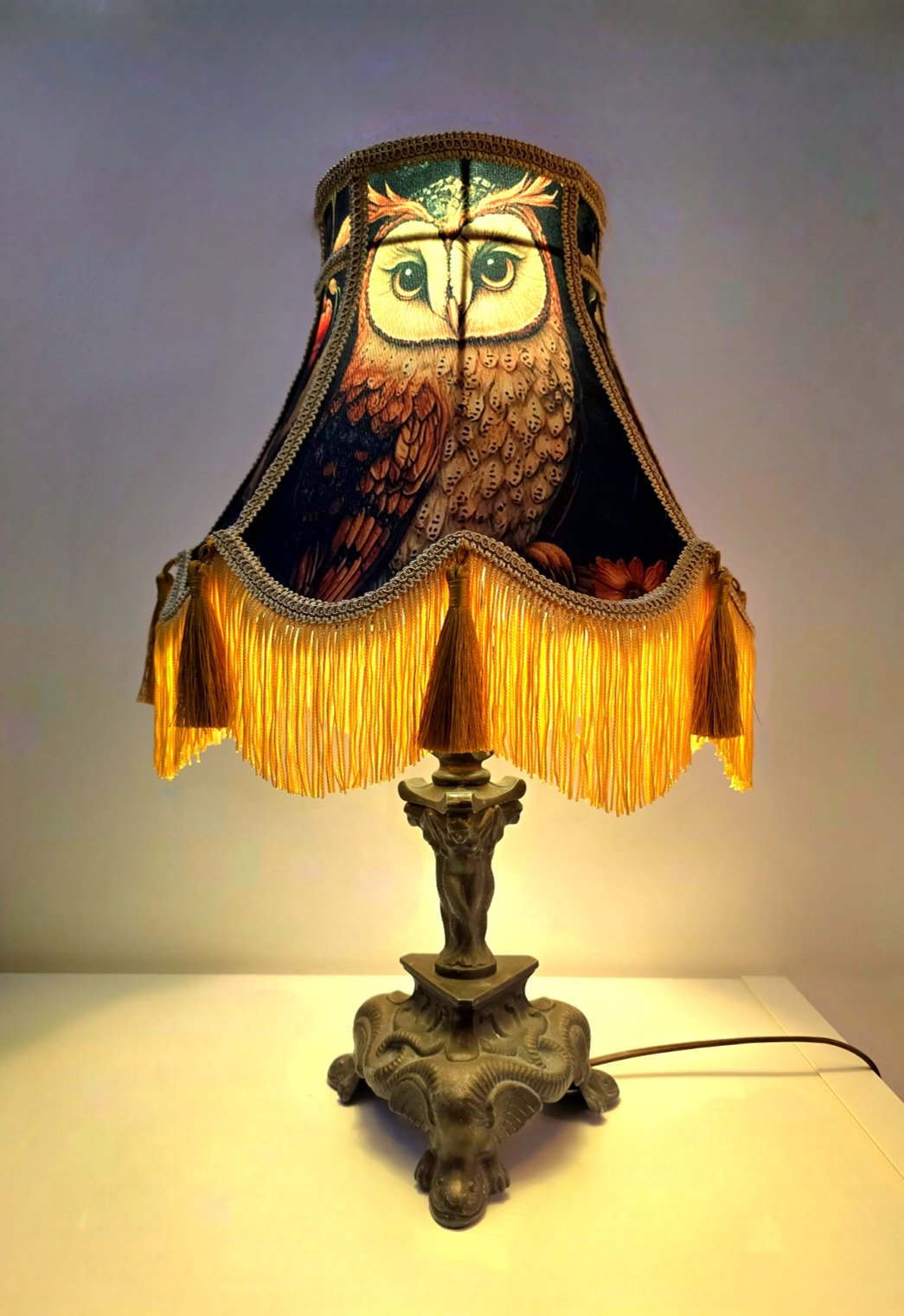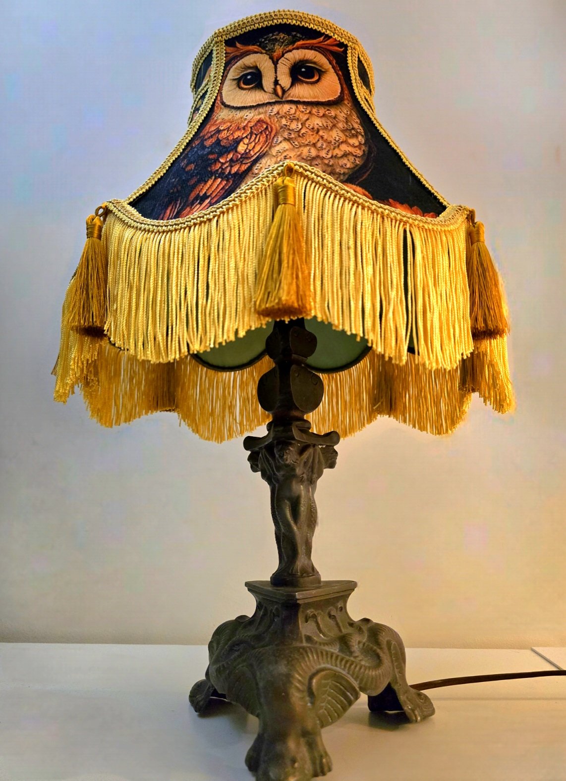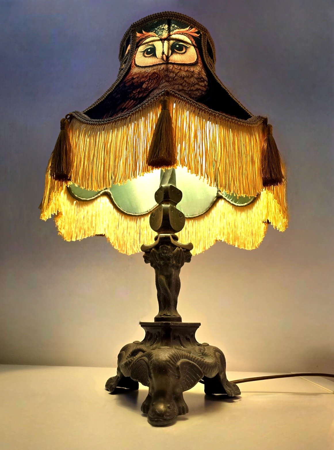 Pöllöaiheella verhoiltu vintage-valaisin – metallinen Art Nouveau -tyylinen jalka – korkeus 52 cm, varjostimen halkaisija alareunasta 32 cm