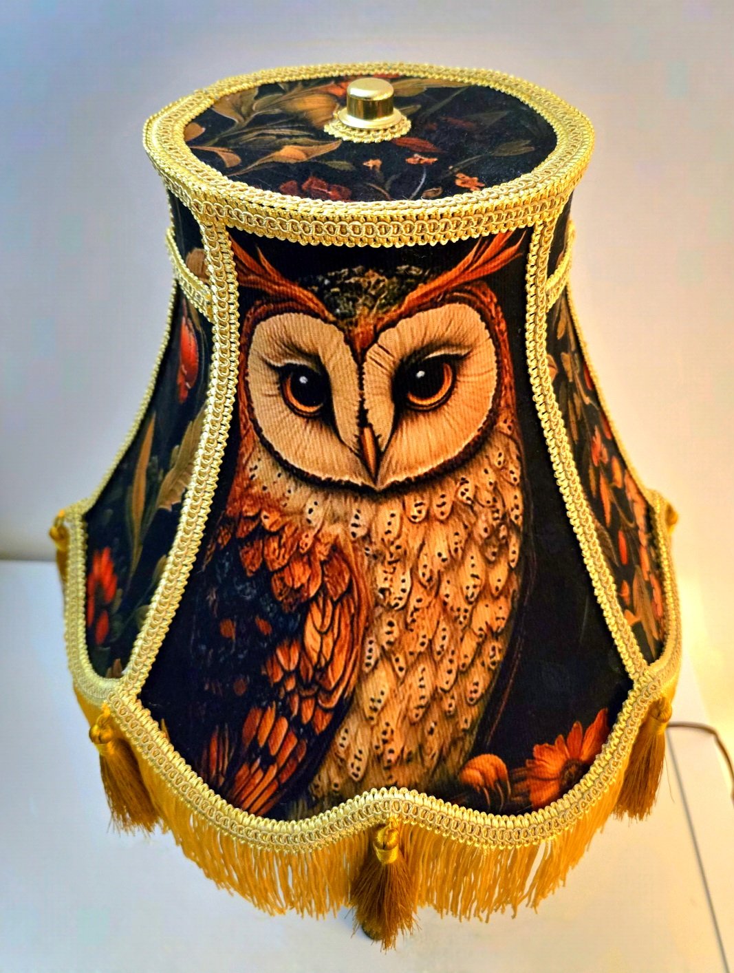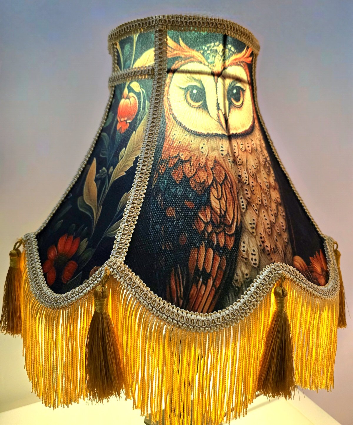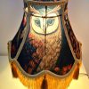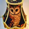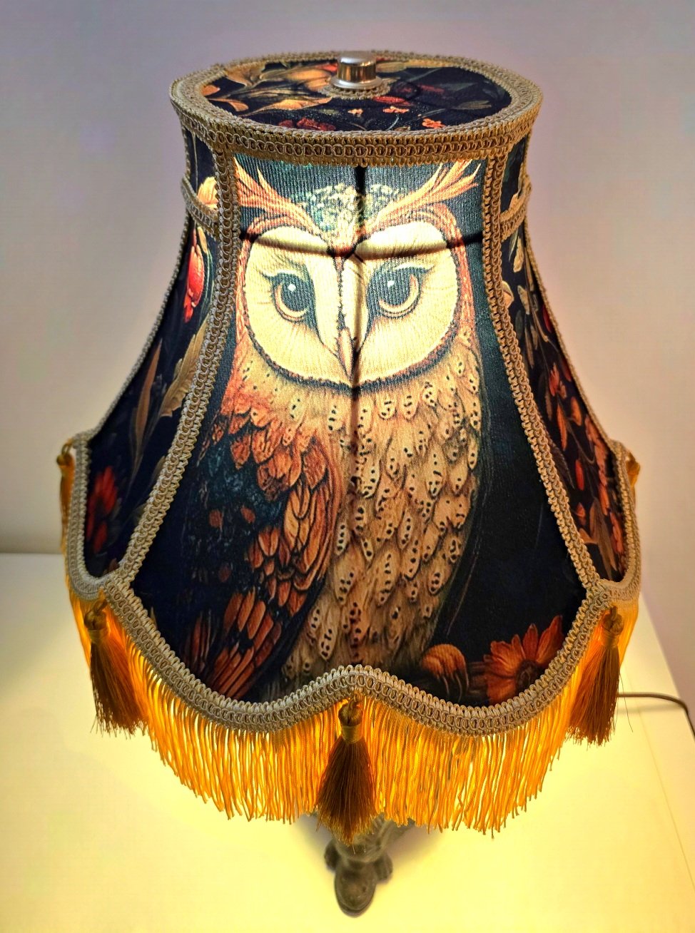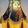 Pöllöaiheella verhoiltu vintage-valaisin – metallinen Art Nouveau -tyylinen jalka – korkeus 52 cm, varjostimen halkaisija alareunasta 32 cm