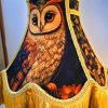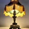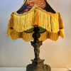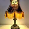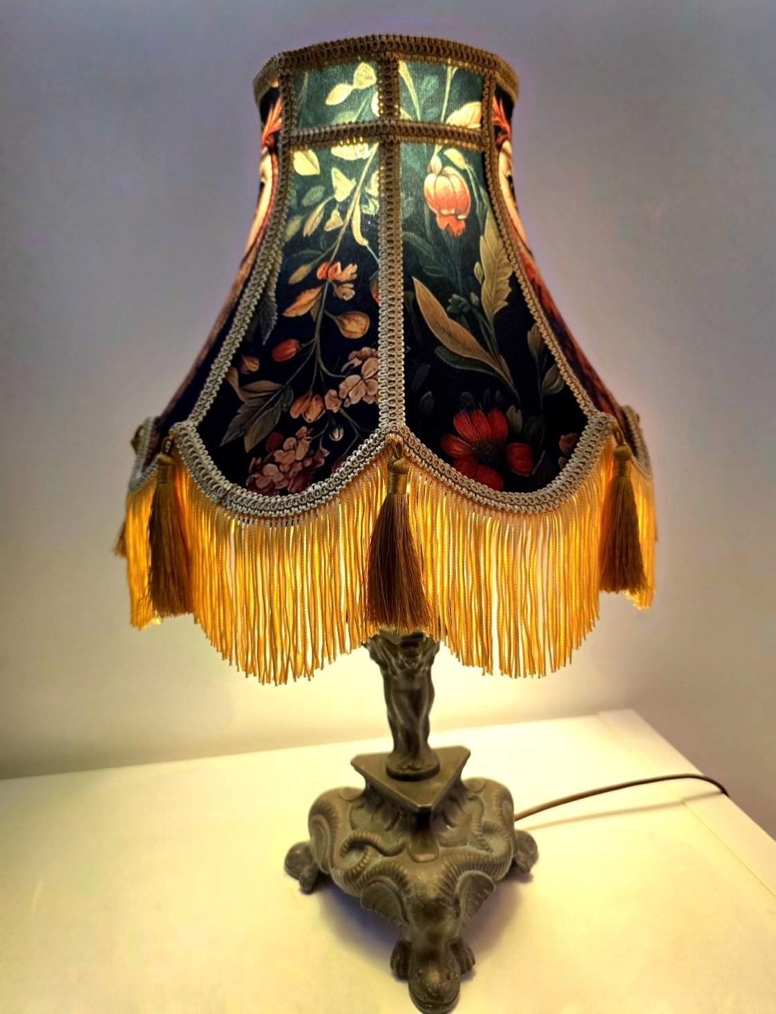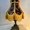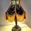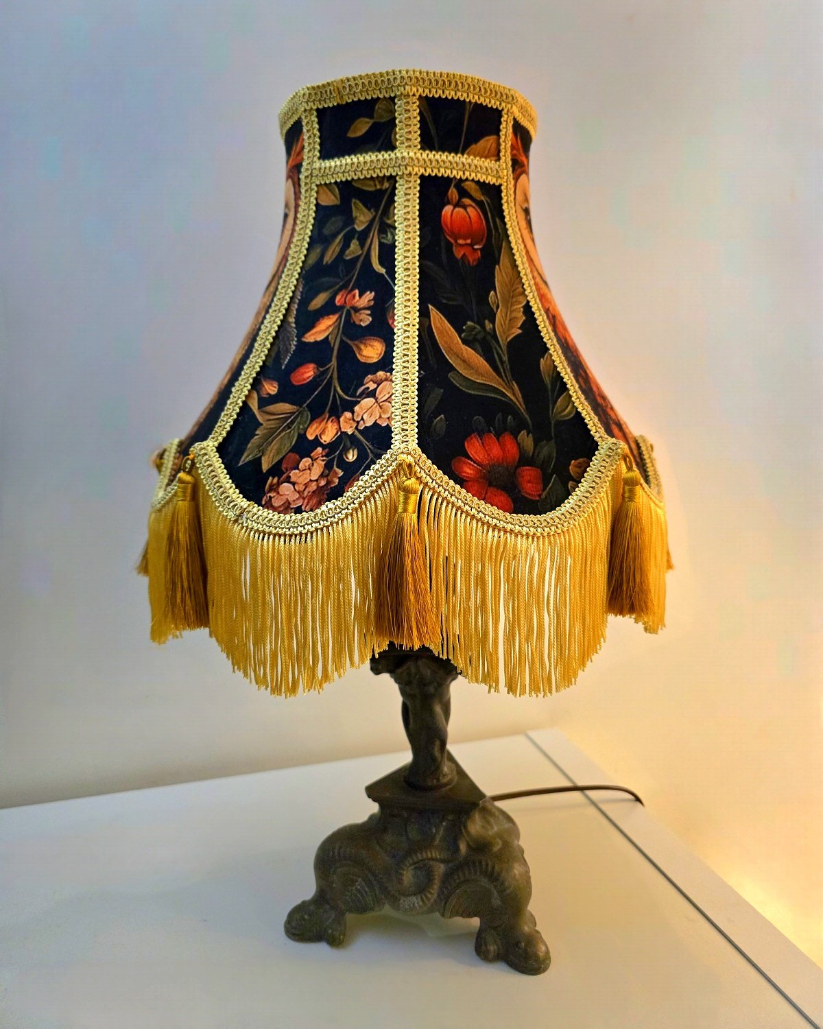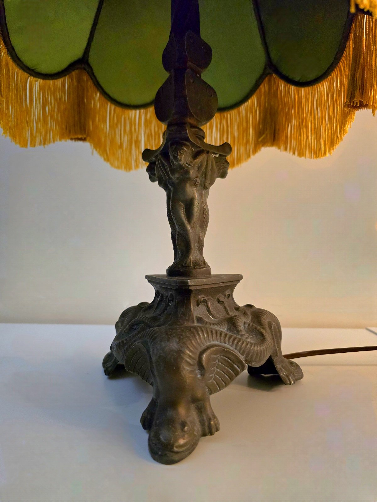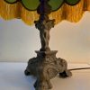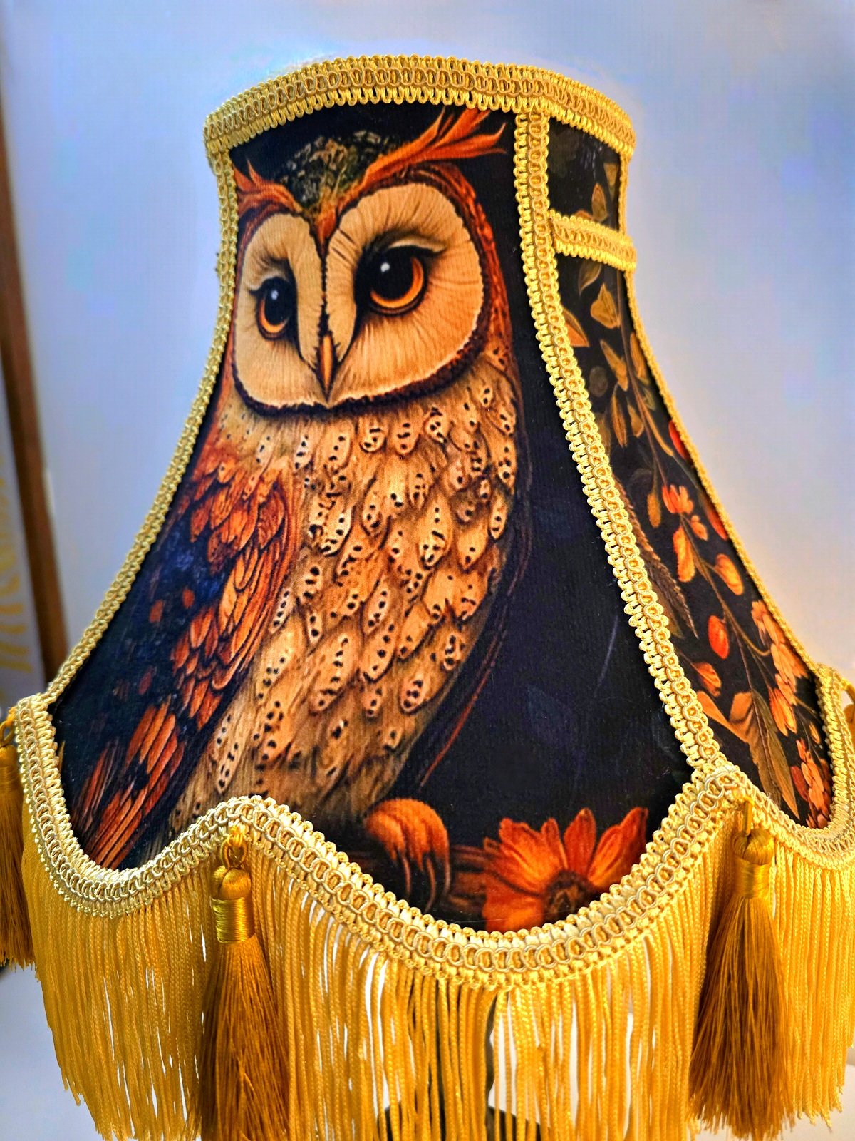 Pöllöaiheella verhoiltu vintage-valaisin – metallinen Art Nouveau -tyylinen jalka – korkeus 52 cm, varjostimen halkaisija alareunasta 32 cm